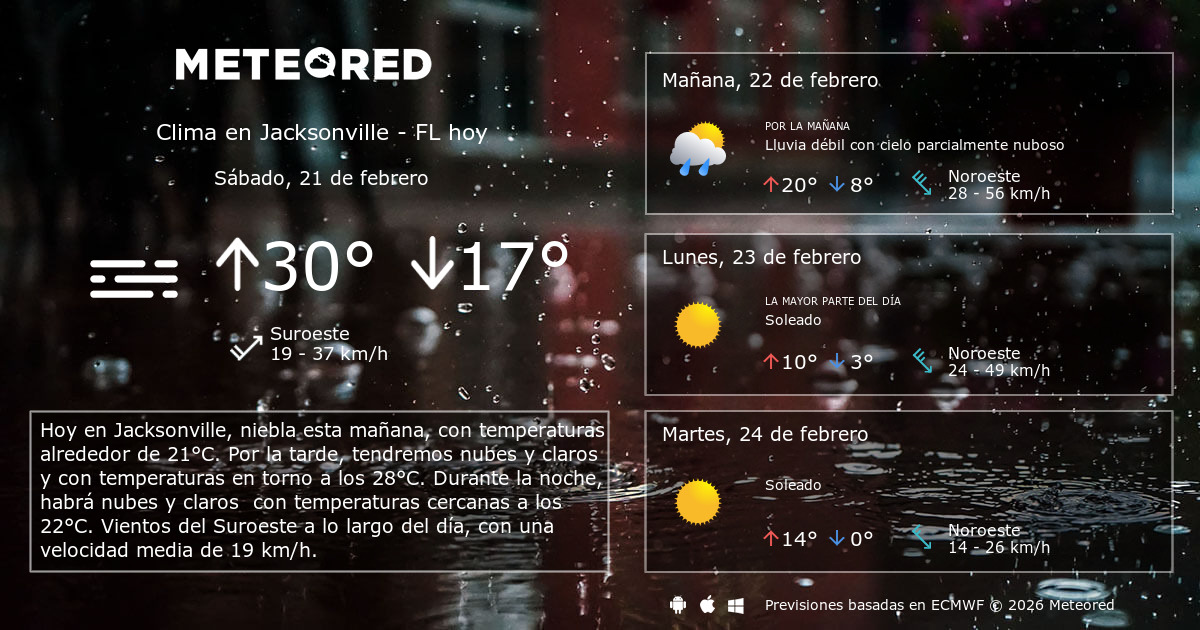 . Temperatures probabilitat de pluges i velocitat del vent a Jacksonville. El tiempo de Jacksonville Florida Florida Estados Unidos para hoy y los próximos días. En la noche cielos claros y temperaturas que oscilarán entre 20ºC y 21ºC. El tiempo en Jacksonville Florida para hoy es de 16ºC de temperatura mínima y 26ºC de máxima con un 87 de nubes y una probabilidad de lluvia del 11.